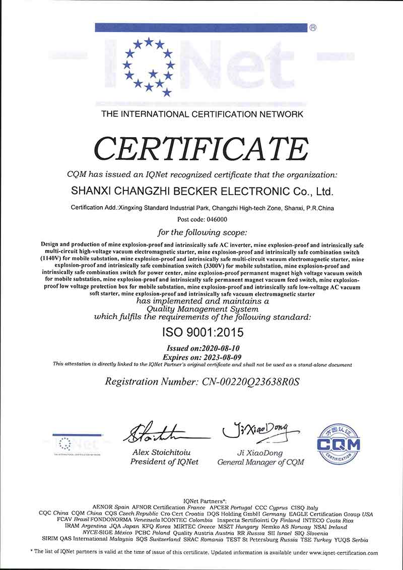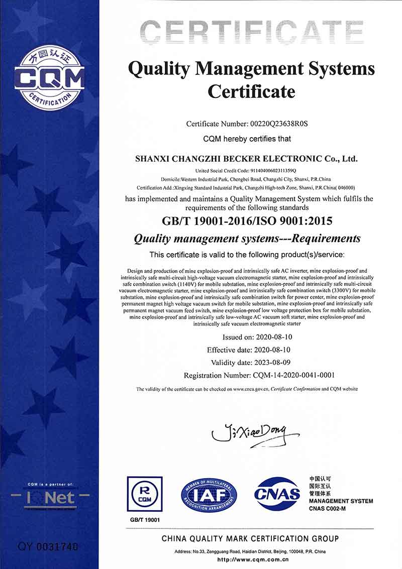 長(zhǎng)治貝克-9001體系認(rèn)證證書